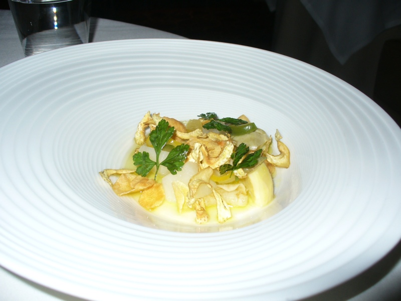 Sumana's "Artichauts en Vierge", with crispy parsley and the like. And Meyer lemon "supremes". No artichokes, just sunchokes and crosnes.